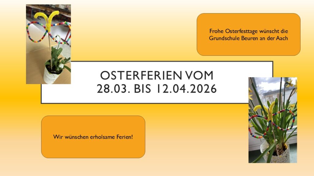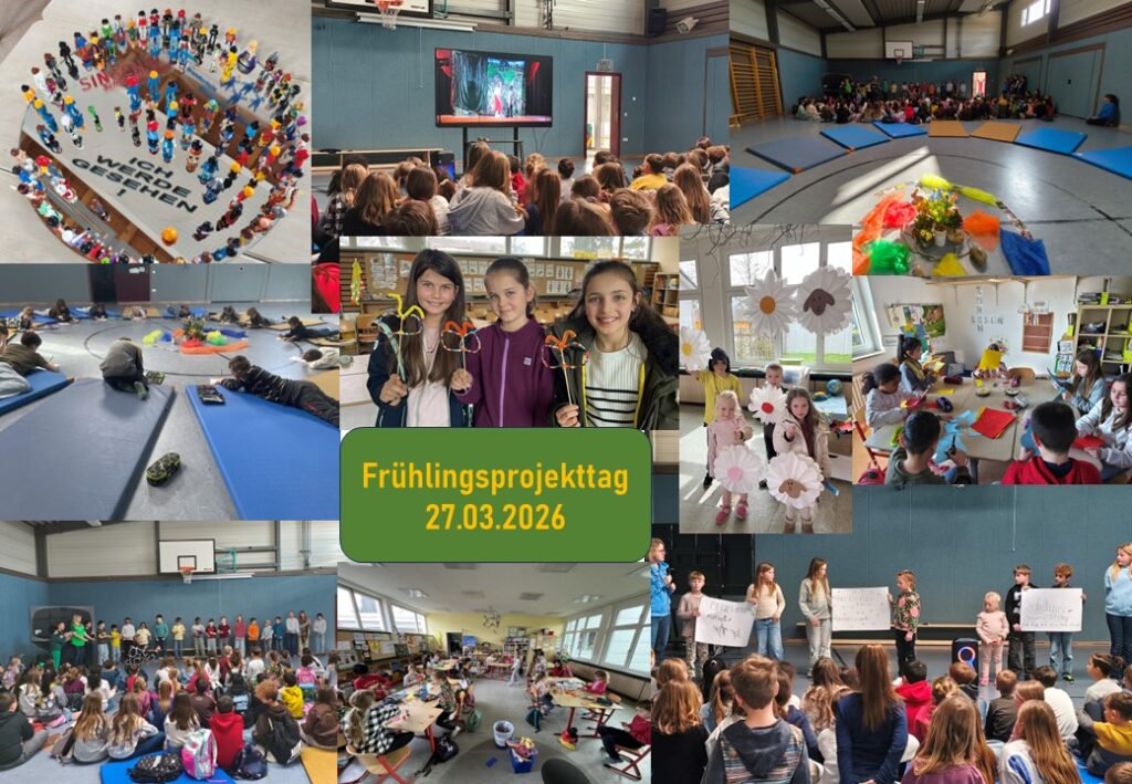 Am 27.03.26 führte die Grundschule Beuren an der Aach einen Frühlingsprojekttag durch. Das Programm war sehr vielfältig. Begonnen haben wir mit einem Lied – und Gedichtsvortrag aus den Klassen 3a und 4. Dann konnte im ganzen Schulhaus gebastelt, gespielt, gerätselt, entspannt, Musik gehört uvm. werden. An diesem Vormittag entstand auch unser Kunstbeitrag zu 25 – jährigen Jubiläum der Schulsozialarbeit der Stadt Singen. Um 11 Uhr traf sich die Schulgemeinschaft zur Filmvorführung über unser Opernworkshop „Hänsel und Gretel in der Schulsporthalle. Der Abschluss des Tages setzte dann die Schulvollversammlung, an der der Schülerrat die gesammelten Wünsche aus den Klassenratsstunden vorbrachte. So konnten wir alle nach einem gelungenen Frühlingsprojekttag in die Osterferien starten.